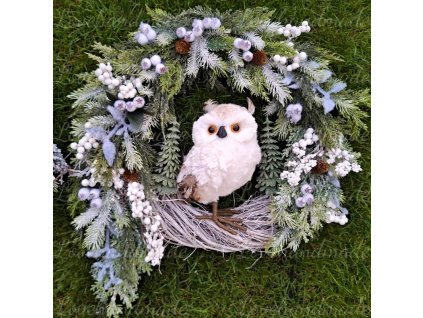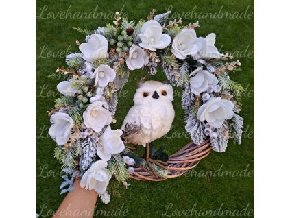 Bohato zdobený polveniec s krásnou realistickou sovou. Krásny prútený základ zdobený niekoľkými druhmi realistickej čečiny a nádhernými zasneženými magnóliami. Šírka cca 42cm,...