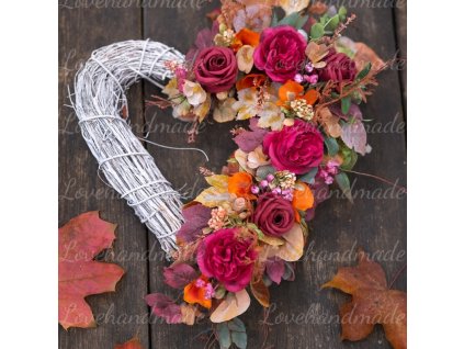Bohato zdobený polveniec srdce s rozmermi cca 35x40cm. Vhodný na zavesenie na dvere. Ruže, jesenné lístie, hortenzie a iná zeleň, tvoria tento neprehliadnuteľný skvost....