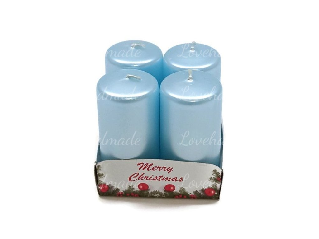 Adventné sviečky, perleťové v svetlo modrej farbe v rovnakej výške. Výška 8cm, priemer 4cm, Vhodné aj do držiakov na čajové sviečky.