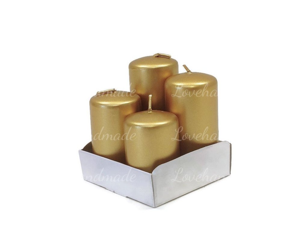 Adventné sviečky, perleťové v zlatej farbe a postupnej výške. Rozmery: výška 6-9cm, priemer 4cm