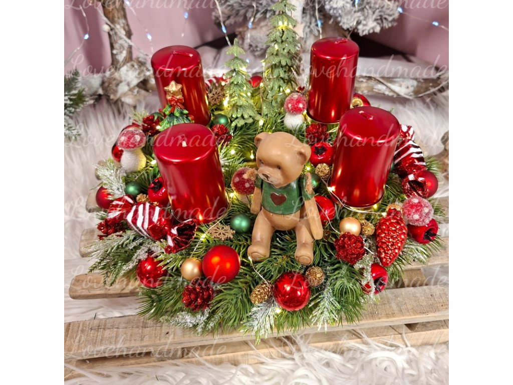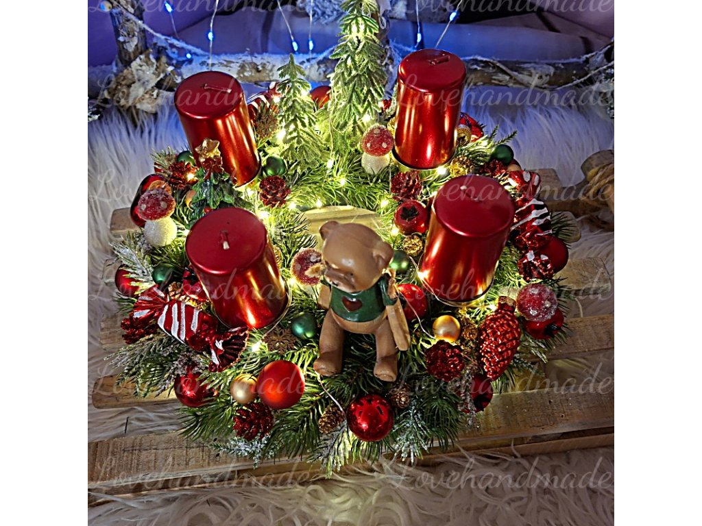 Nádherný adventný veniec s figúrkou macka. Celý veniec je obmotaný LED svetielkami v teplej bielej farbe na baterky.