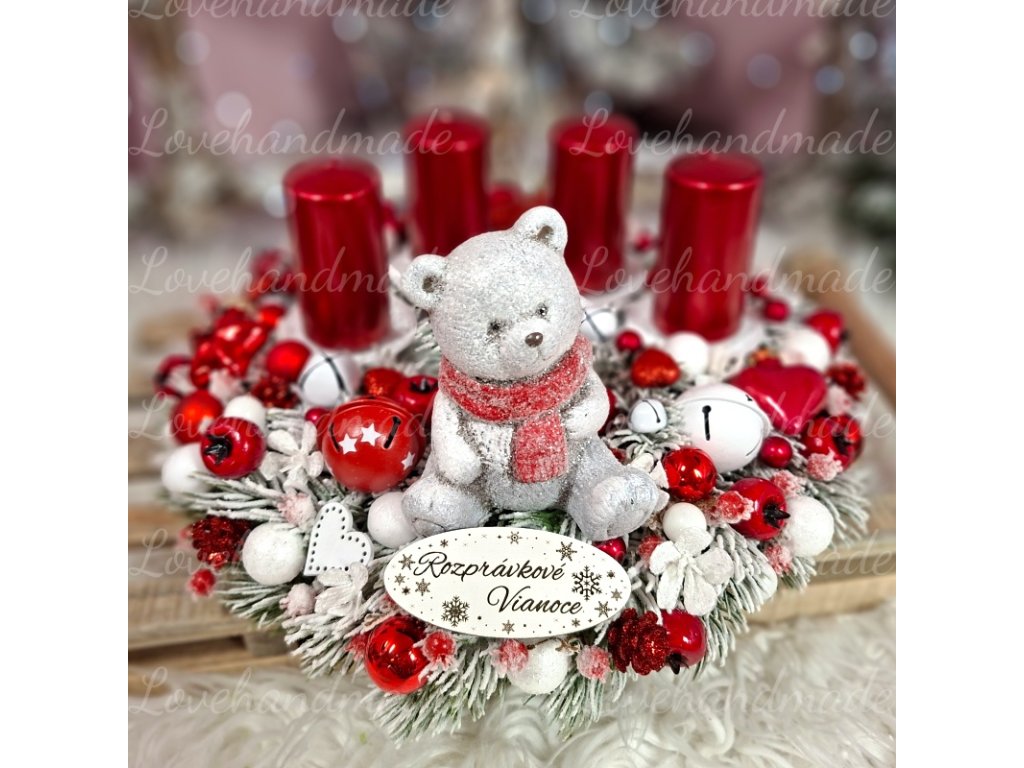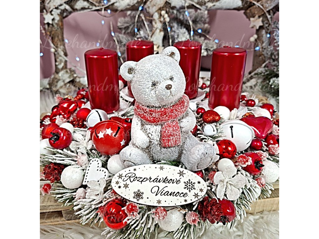Nádherný adventný veniec s figúrkou polárneho macka. Základ je kvalitný zasnežený 3d veniec.