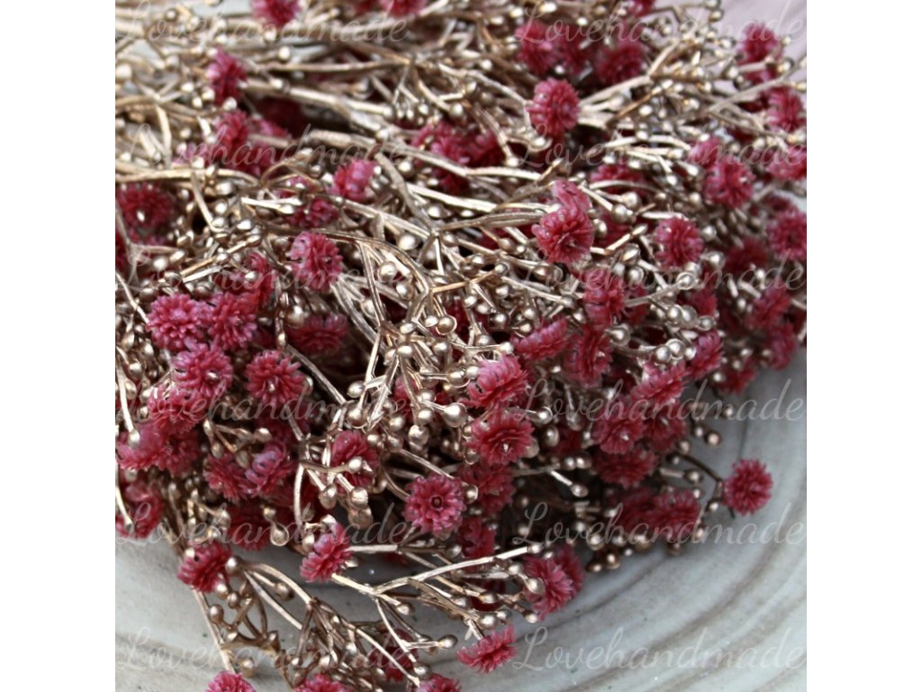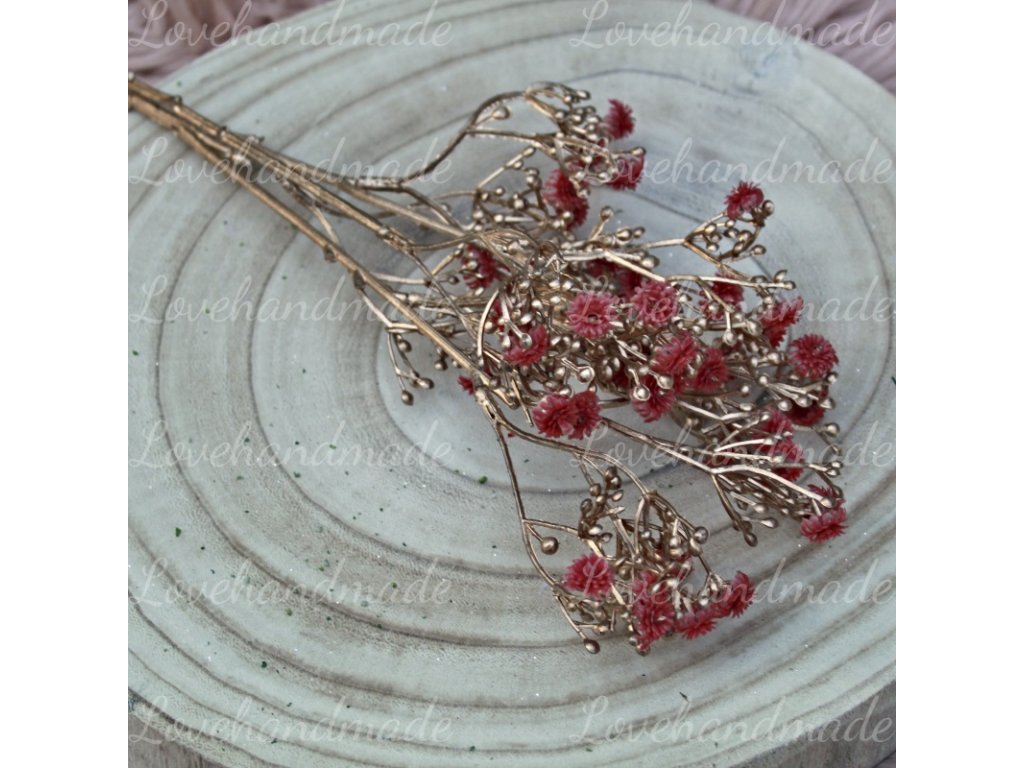 Exclusive gypsomilka je nádherný pozlátený konár s tmavočervenými kvietkami. Dokonale sa hodí na zimné, vianočné, ale aj jesenné dekorácia. Celková dĺžka jednej halúzky je 68cm. Cena za 1 halúzku.