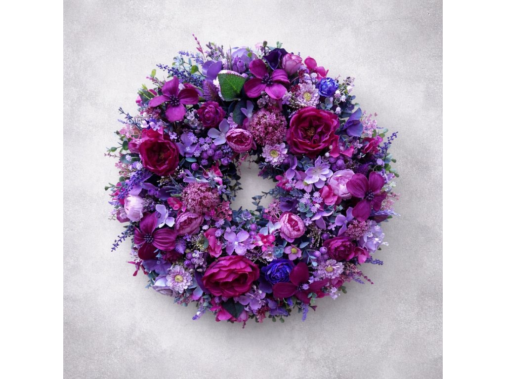 Nádherný veniec vo fialových odtieňoch s priemerom cca 50cm.