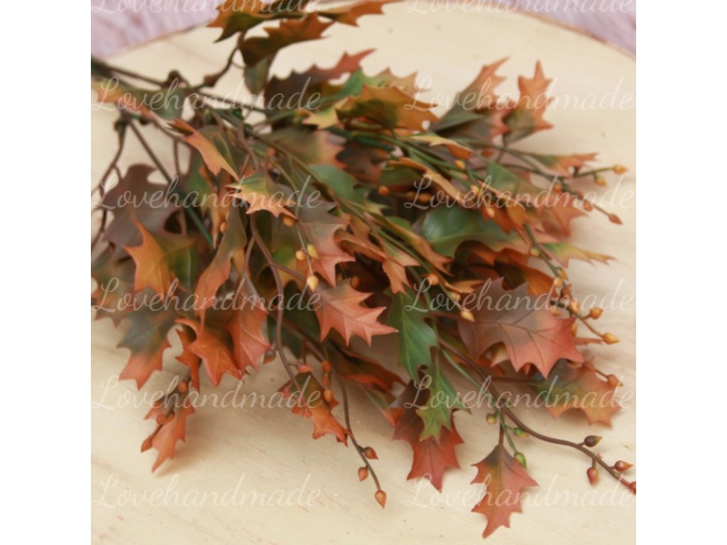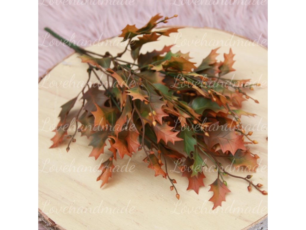 Veľká hustá kytica plastových lístkov zeleno-oranžovej farby. Dĺžka cca 38cm. Vhodná na jesenné alebo celoročné aranžovanie.