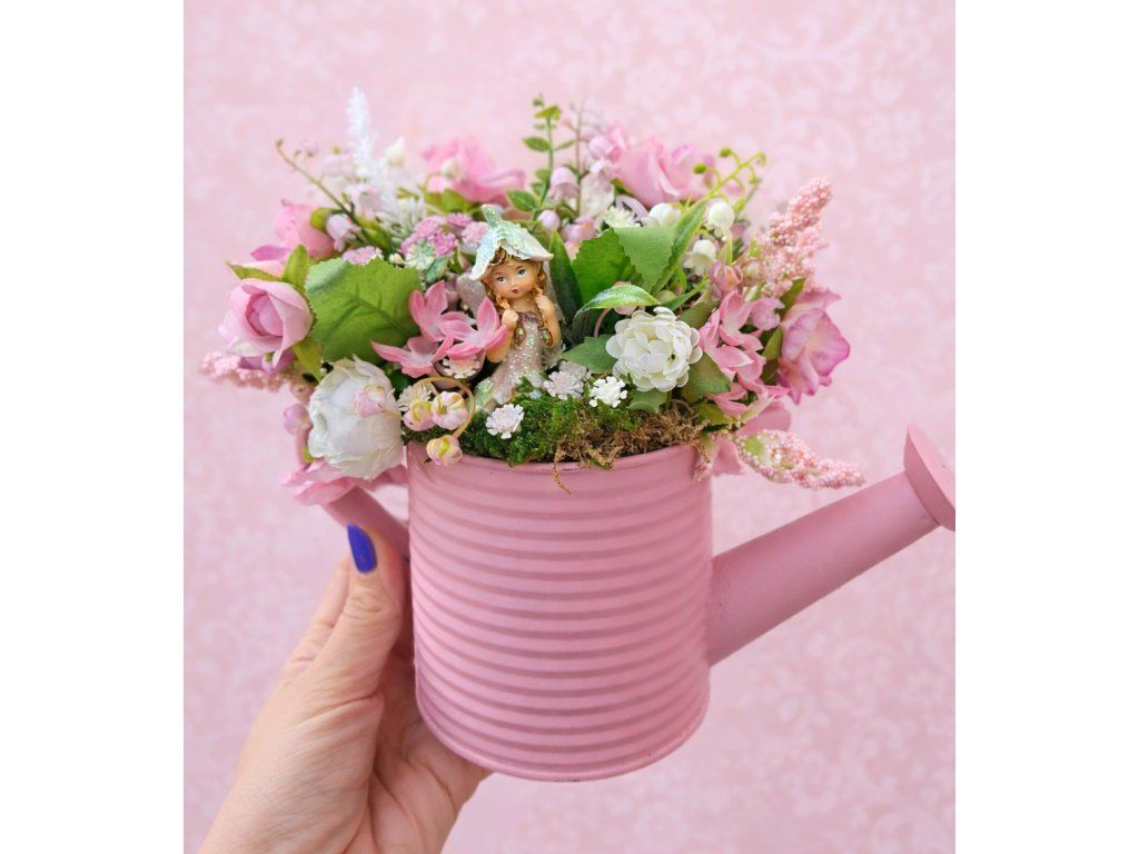 Kovová konvička plná kvetov s krásnou vílou. Krásny darček ku Dňu matiek alebo ku Dňu učiteľov.