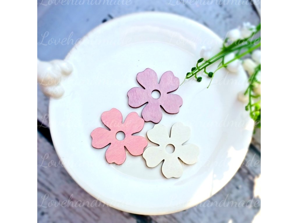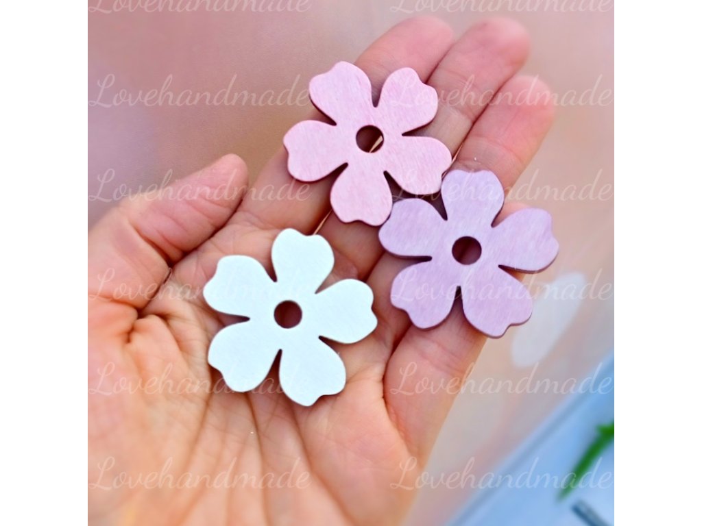 Drevené kvetinky farebné mix druhov v balení po 3ks. Vhodné na jarné a veľkonočné aranžovanie. Farby: ružová, fialková, biela.. Rozmer cca 4cm.