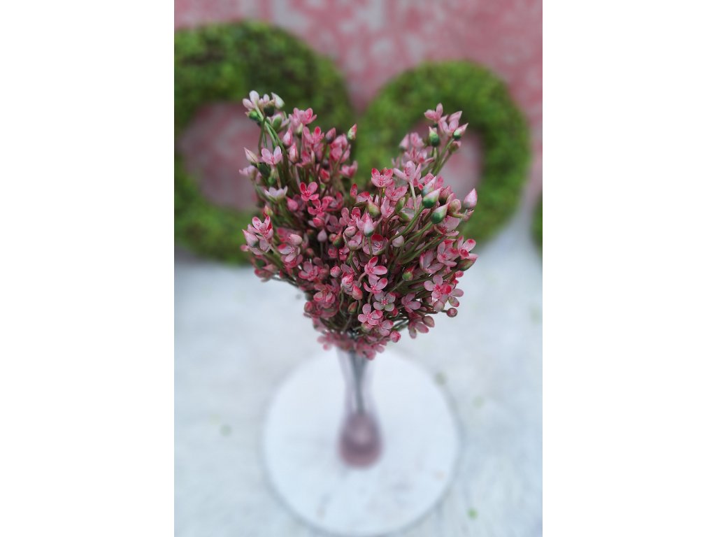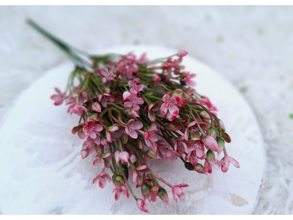 Plastový trs drobných kvietkov v kytičke. Kvalitné prevedenie. Farba ružová a zelená. Výška cca 32cm.