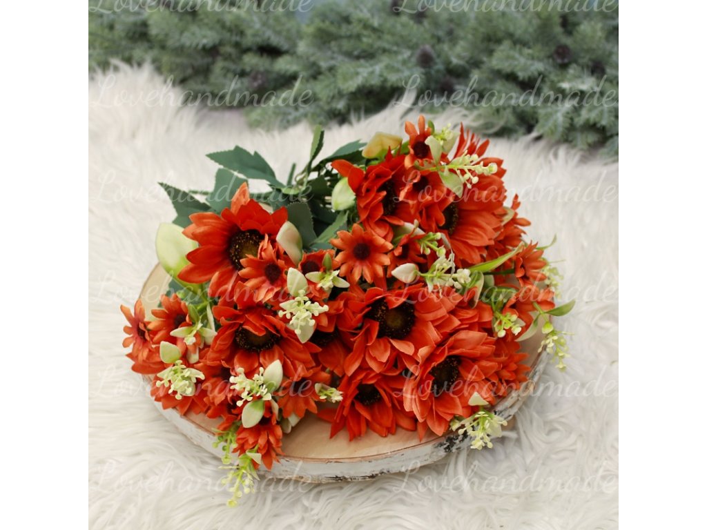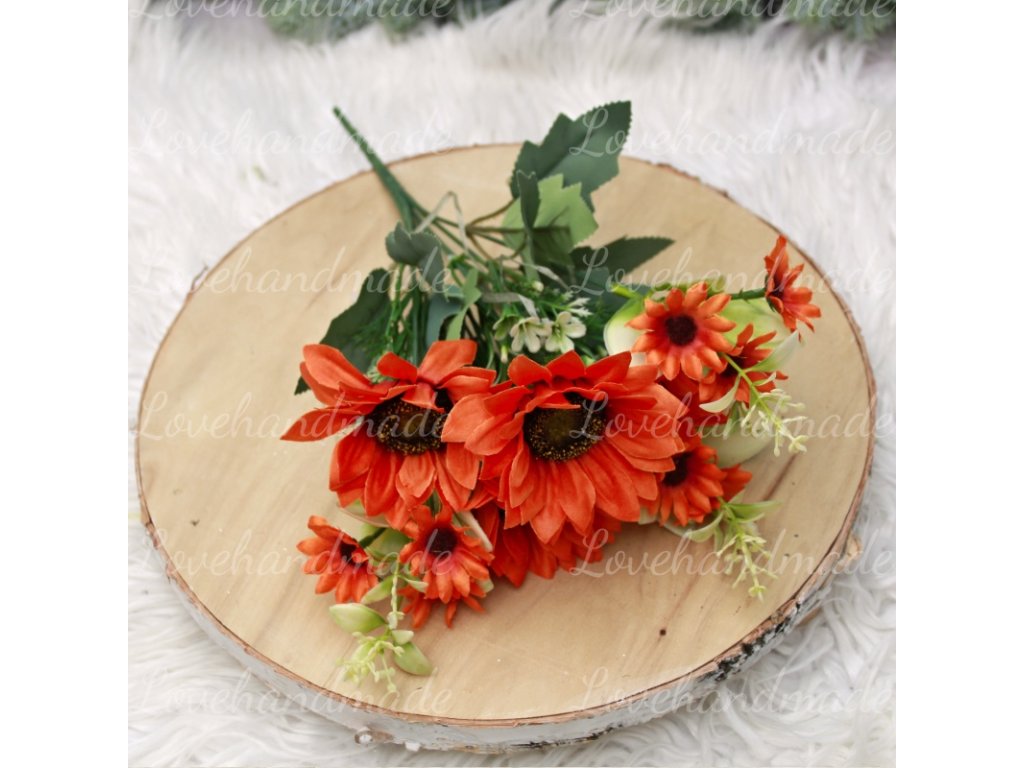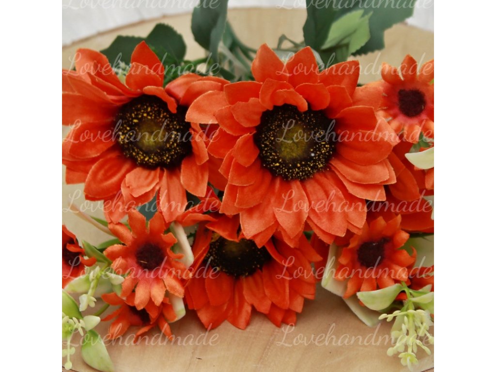 Nádherná kytica slnečníc v sýtej oranžovej farbe s výškou cca 31cm. Vhodná do vázy alebo na dalšie aranžovanie.