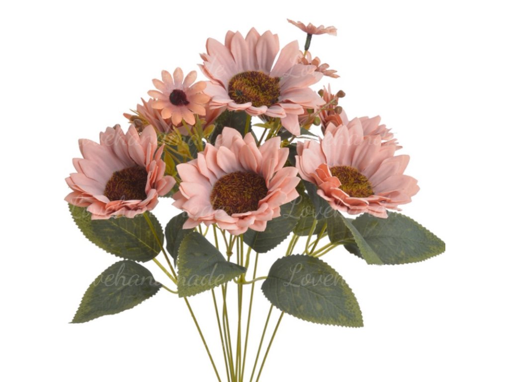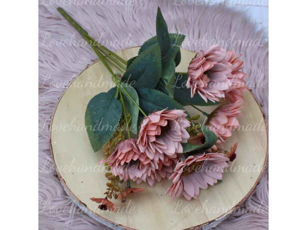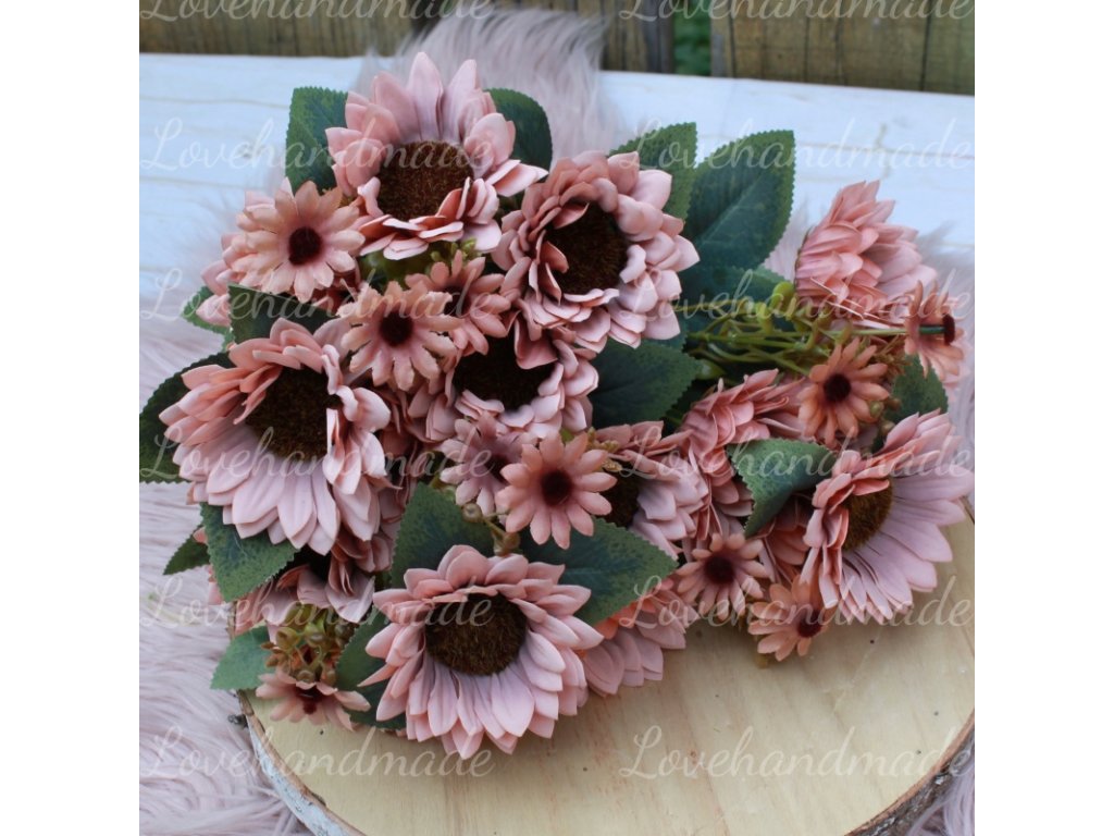 Nádherná kytica slnečníc v staroružovej farbe s výškou cca 45cm. Vhodná do vázy alebo na dalšie aranžovanie.