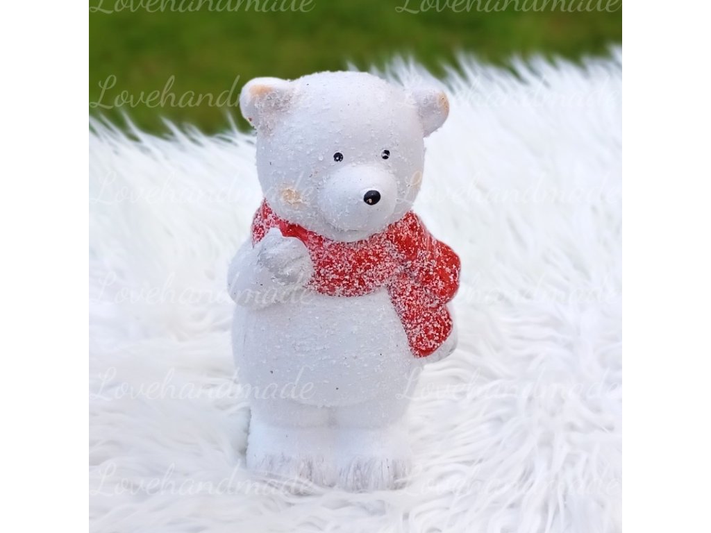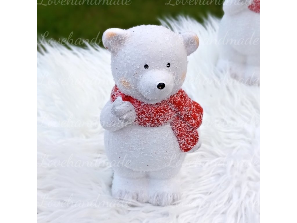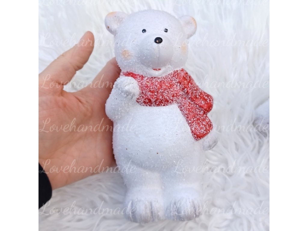 Krásny macko s červeným šálom, posypaný sniežikom a glitrom. Vhodný len ako ozdoba na komodu, či stôl alebo na vianočné aranžovanie. Rozmery sovičky sú v.17cm.