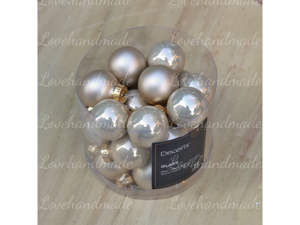 Nádherné sklenené guľky v boxe v krásnej krémovej lesklej a krémovej matnej farbe. Vhodné na vianočné a zimné aranžovanie vencov, ikebán a svietnikov alebo na ozdobeni stromčeka. Priemer gule je cca 2,5cm a dodáva sa v balení po 24ks. Mix lesklých a matných gulí.