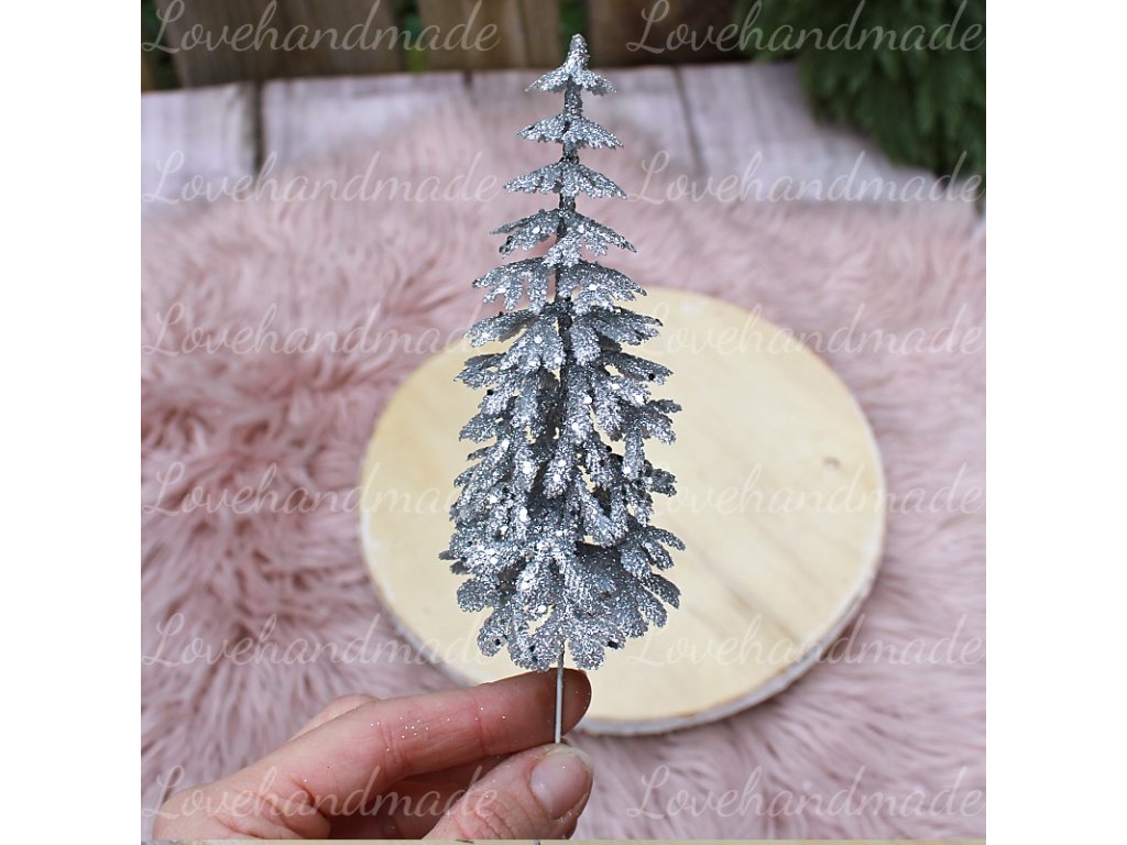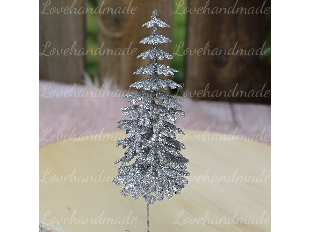 Stromček zápich strieborný vhodný na aranžovanie krajiniek, vencov a i. Výška cca 20cm. Materiál plast. Cena za 1ks.