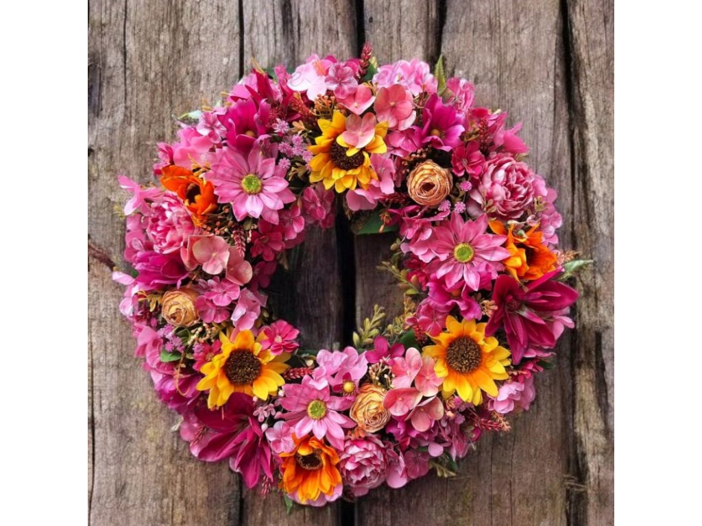 Bohato zdobený letno-celoročný veniec s hortenziami, slnečnicami a inými kvalitnými kvetmi. V ružovo-cyklaménovom prevedení. Základ je plastový veniec z lístočkov. Zozadu stužka na zavesenie.