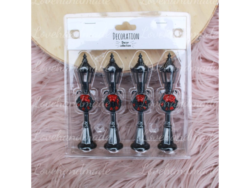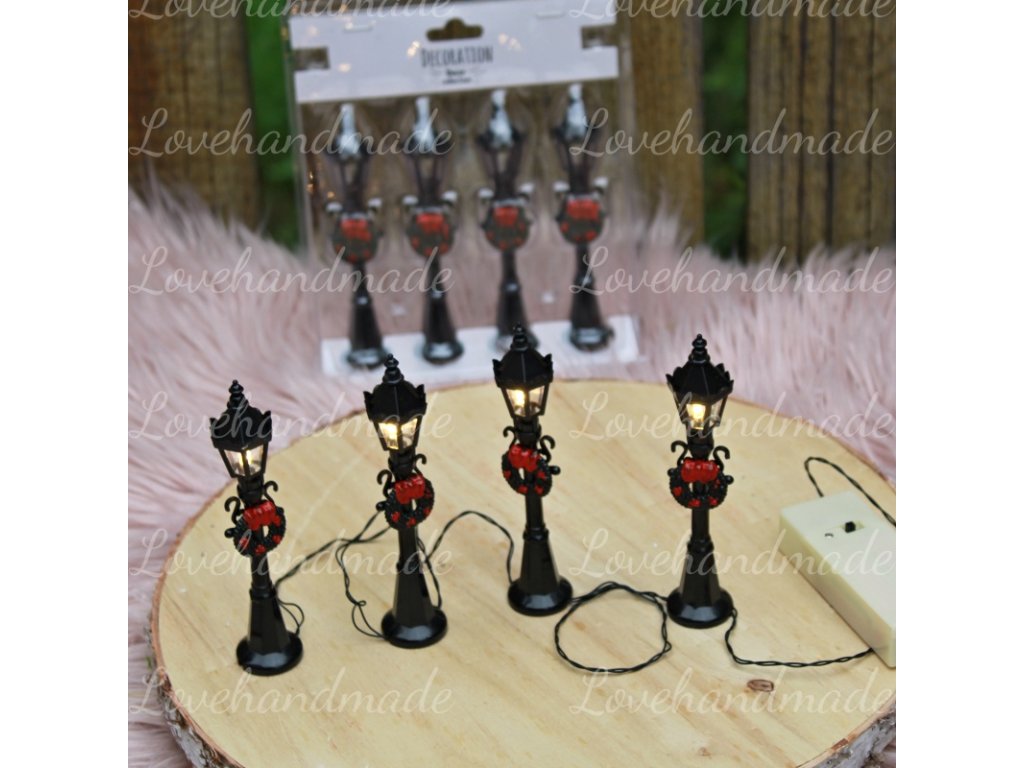 Plastové pouličné lampy vo vianočnom šate, ktoré aj svietia. Osvetlenie je možné zapnúť, napája sa z batérie (batéria nie je súčasťou balenia). Dekoračný doplnok pre vianočné aranžovanie. Výška: 12 cm.
