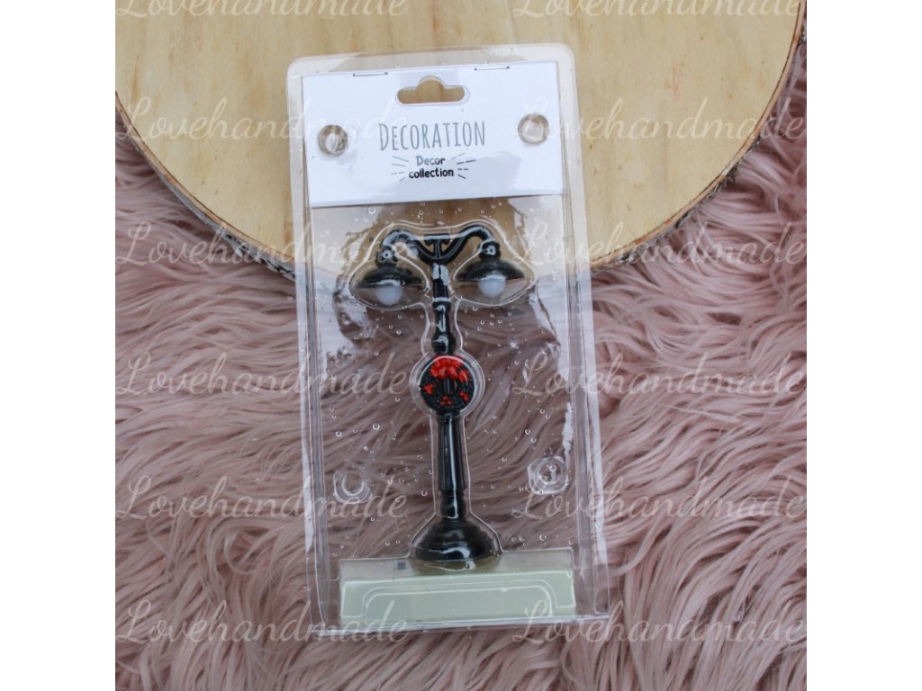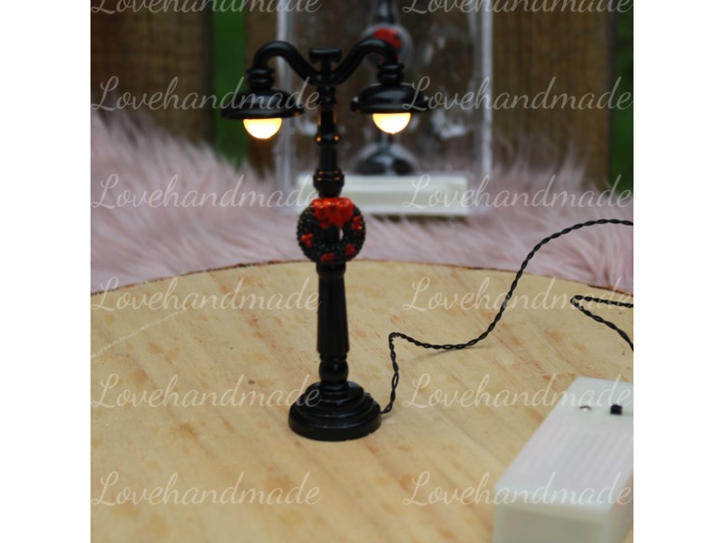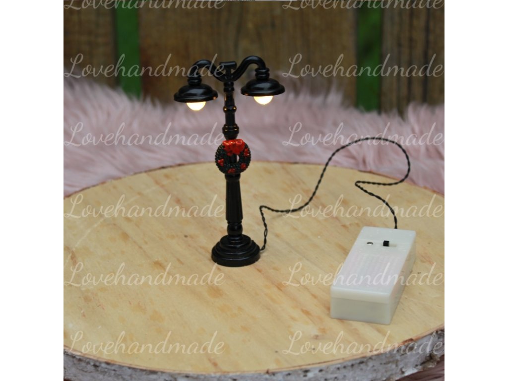 Plastová pouličná lampy vo vianočnom šate, ktorá aj svieti. Osvetlenie je možné zapnúť, napája sa z batérie (batéria nie je súčasťou balenia). Dekoračný doplnok pre vianočné aranžmány. Výška cca 12cm.