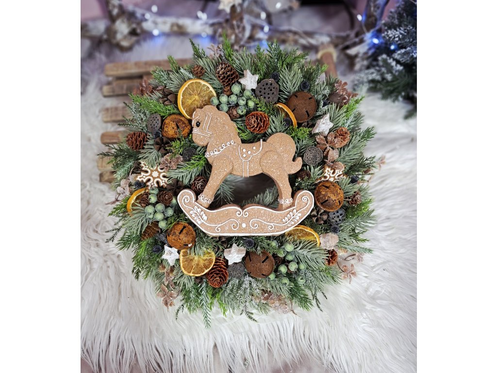 Nádherný vianočný veniec s neprehliadnuteľným perníkovým koníkom.